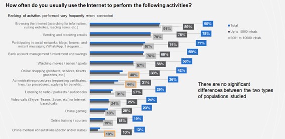 Most frequent online activities include: browsing the Internet (90%), sending emails (78%), social media use (71%), online banking (69%), streaming movies (56%), online shopping (42%), administrative procedures (36%), podcasts/radio (29%), video calls (24%), online gaming (23%), online training (19%), and online medical consultations (13%).