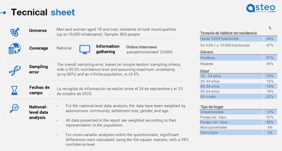 The annual study conducted by Observatorio Asteo is based on a survey of Internet users living in rural areas with fewer than 10,000 inhabitants. It analyzes the digital environment and quality of life in rural communities across Spain, with a particular focus on municipalities with fewer than 10,000 and 5,000 residents.
