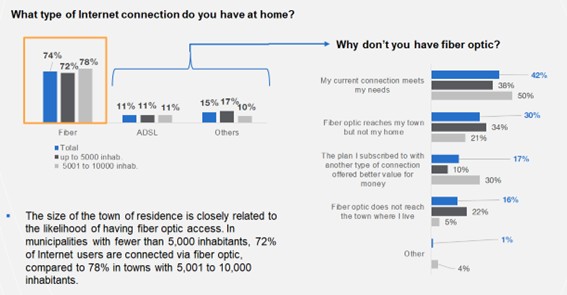 74% of the houses of Internet Users surveyed have optic fiber connection. Nevertheless, The size of the town of residence is closely related to the likelihood of having fiber optic access. In municipalities with fewer than 5,000 inhabitants, 72% of Internet users are connected via fiber optic, compared to 78% in towns with 5,001 to 10,000 inhabitants.